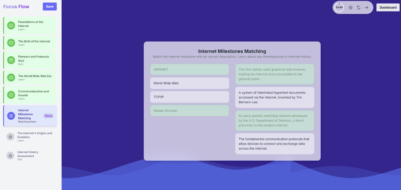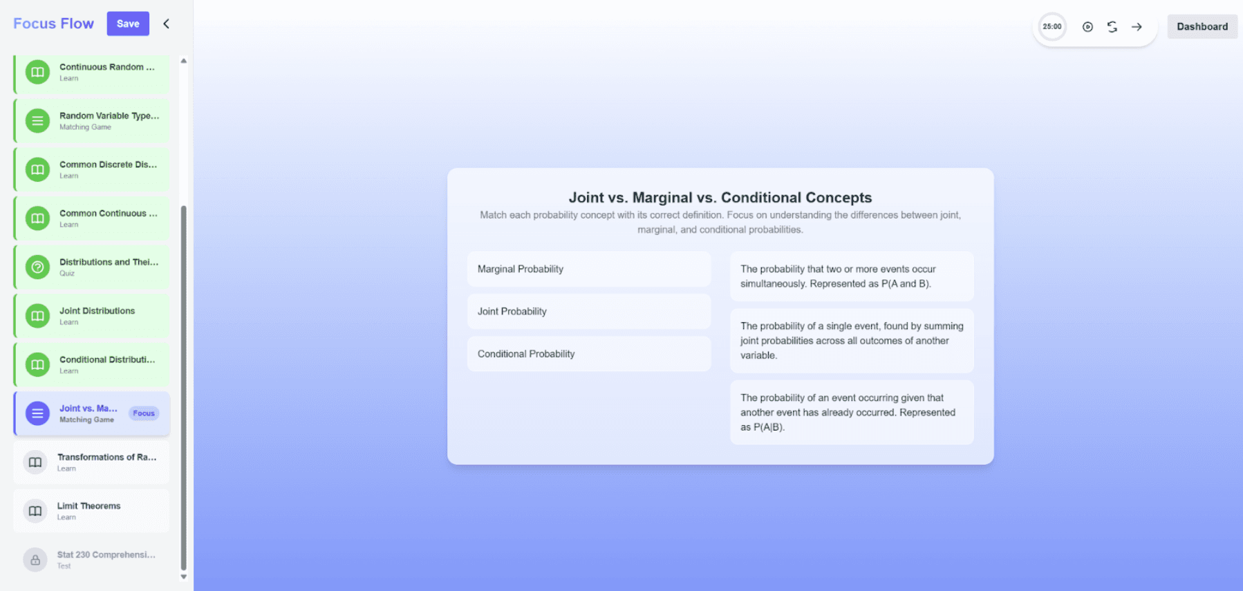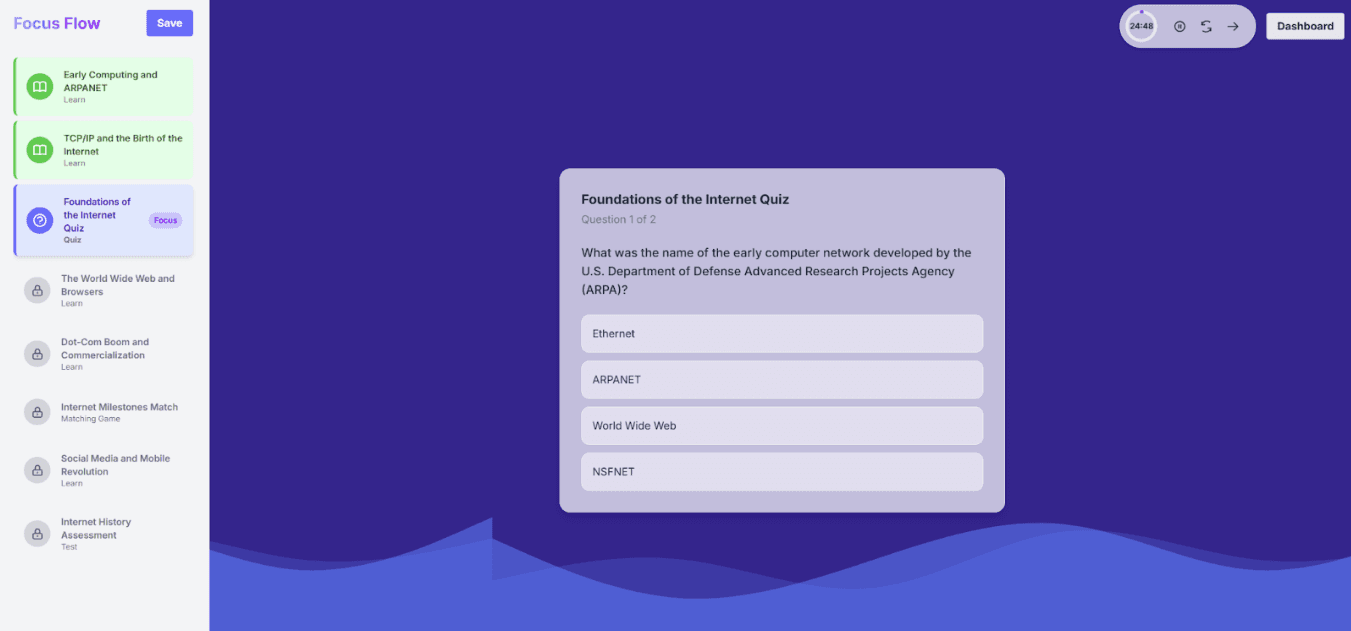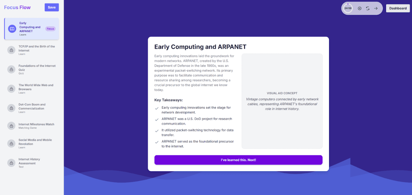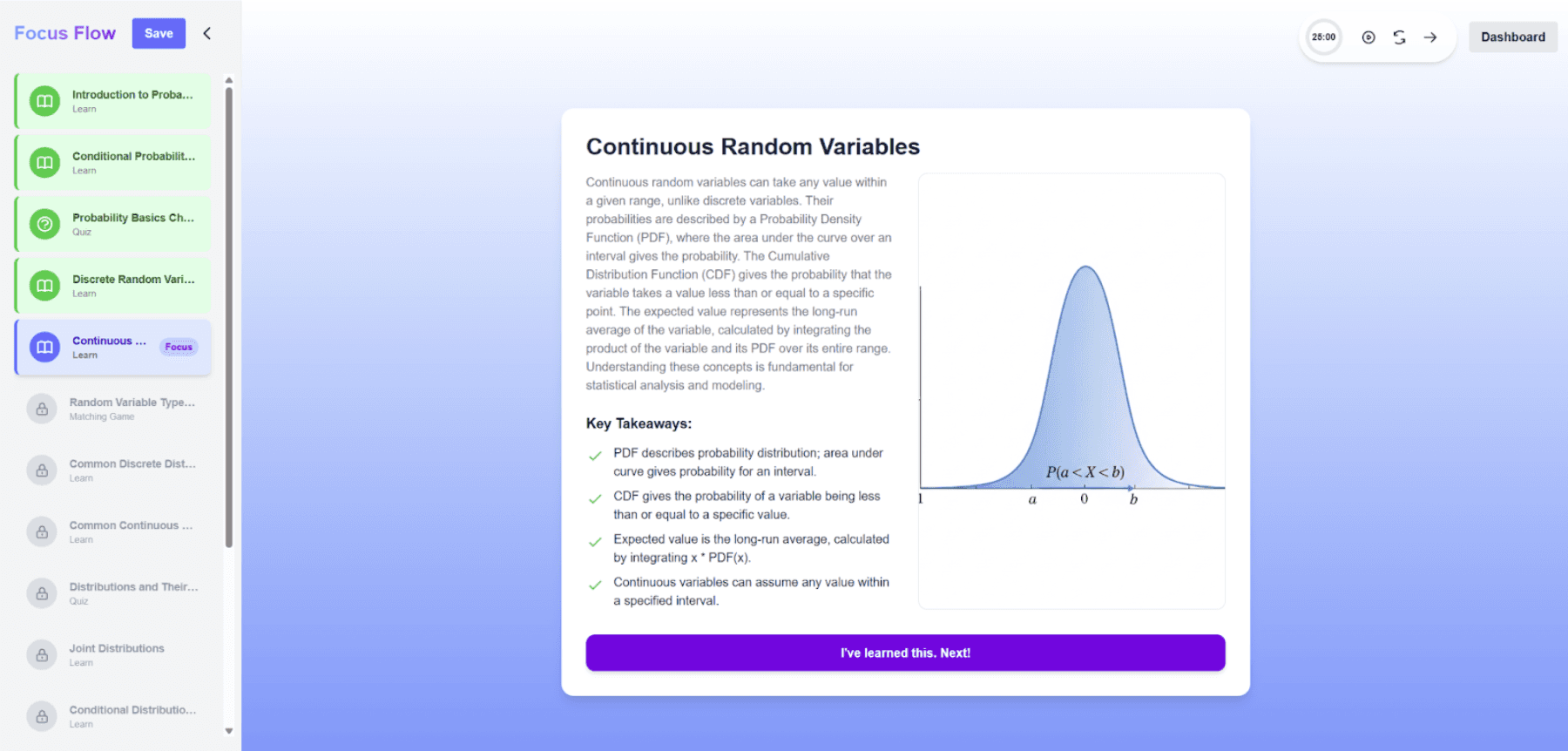 Working on Focus Flow taught us a lot about designing with clarity and user needs at the center. Our goal was to create a tool that helps students move through assignments in a structured, step-by-step way, so the process began with defining the problem, mapping a simple user flow, and building an initial prototype. As we iterated, we focused on improving navigation, simplifying CTAs, tightening the UI, and reducing moments of confusion that could overwhelm users. The shift from Prototype 1 to Prototype 2 showed how much value comes from refining small details; contrast, layout, flow, and functionality all directly shaped how intuitive the experience felt. Overall, the project helped us understand the importance of iteration, user-friendly structure, and designing with real struggles in mind, especially for students who deal with distraction or cognitive overload.