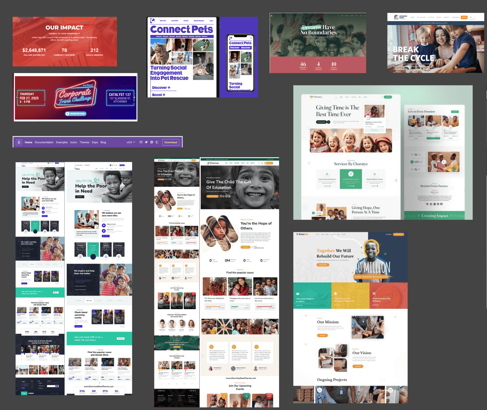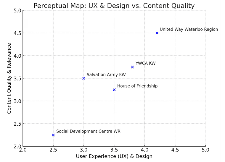 The initial research for this project began before selecting the non-profit we would partner with. We wanted to ensure our work would have a real impact, so we started by examining several organizations to understand who might benefit most from a refreshed digital identity. We reviewed four non-profits that showed clear opportunities for improvement and one that was performing well as a benchmark. Using Similarweb data, our design expertise, and insights from focus groups, we conducted a landscape analysis to evaluate their digital presence. Our categories and metrics were as follows: