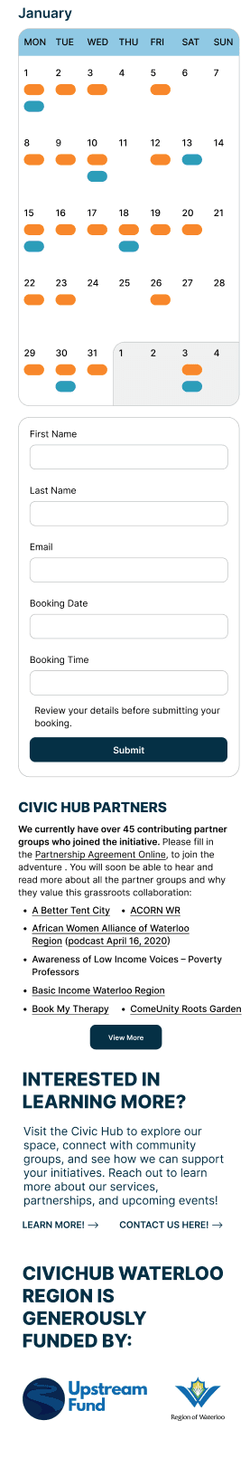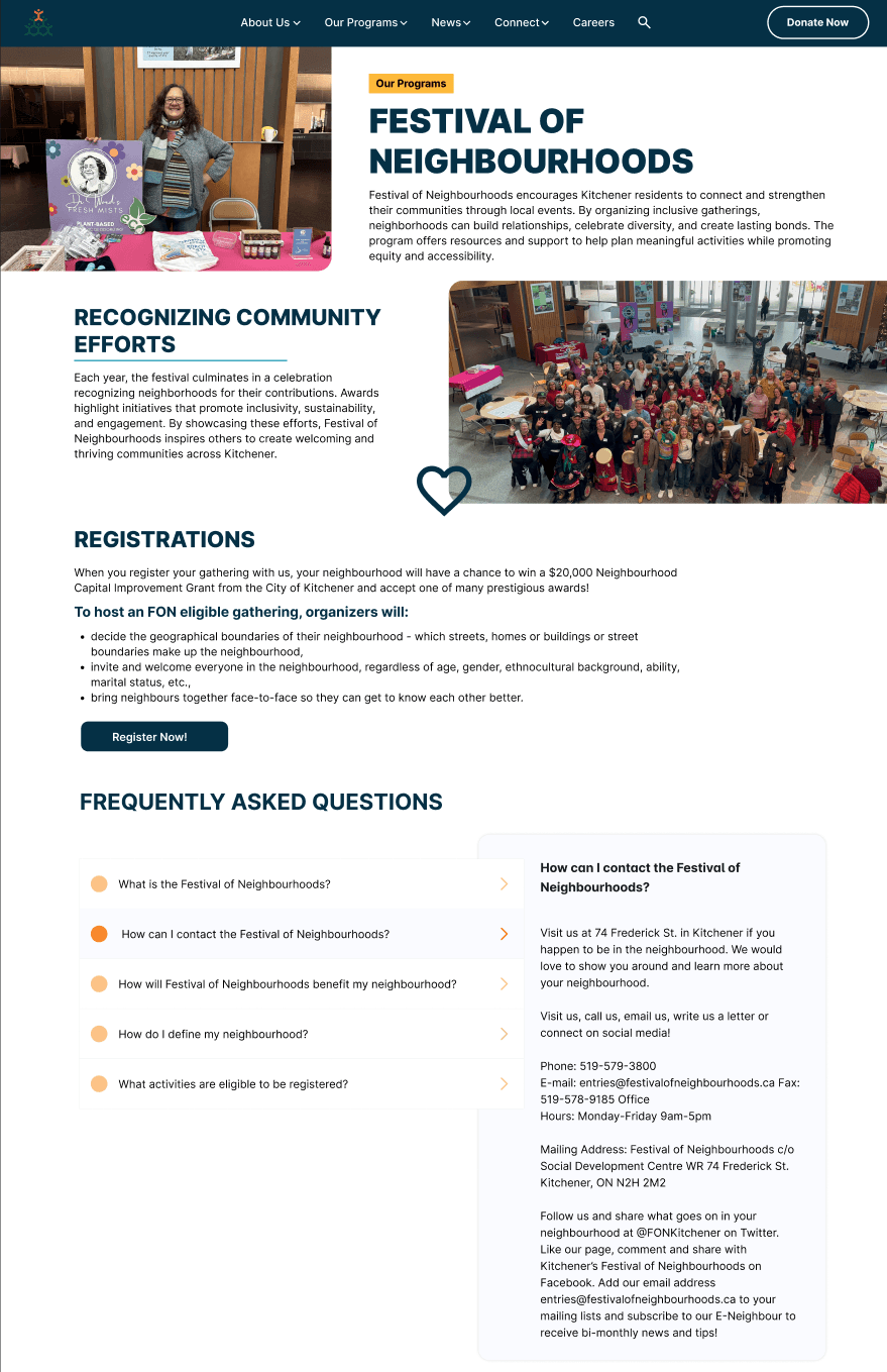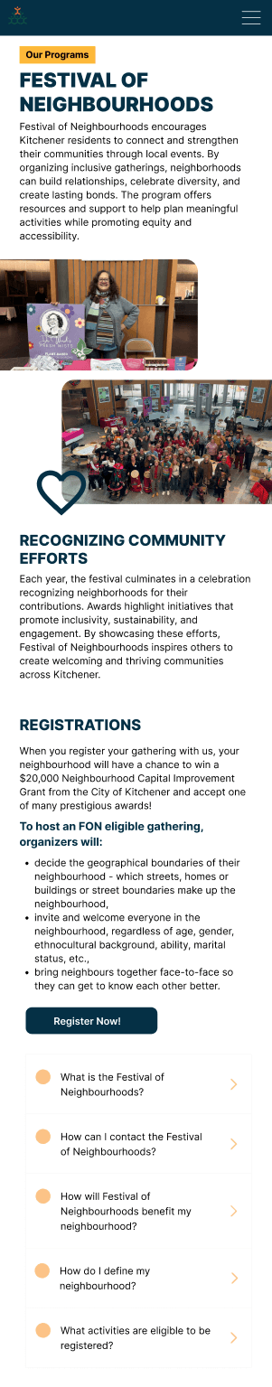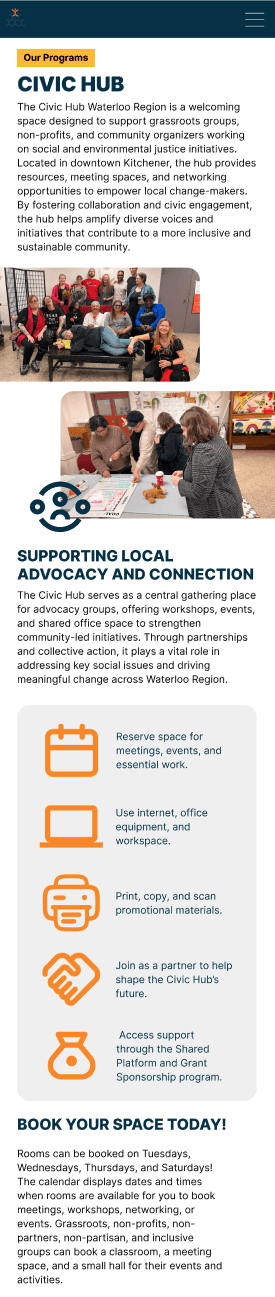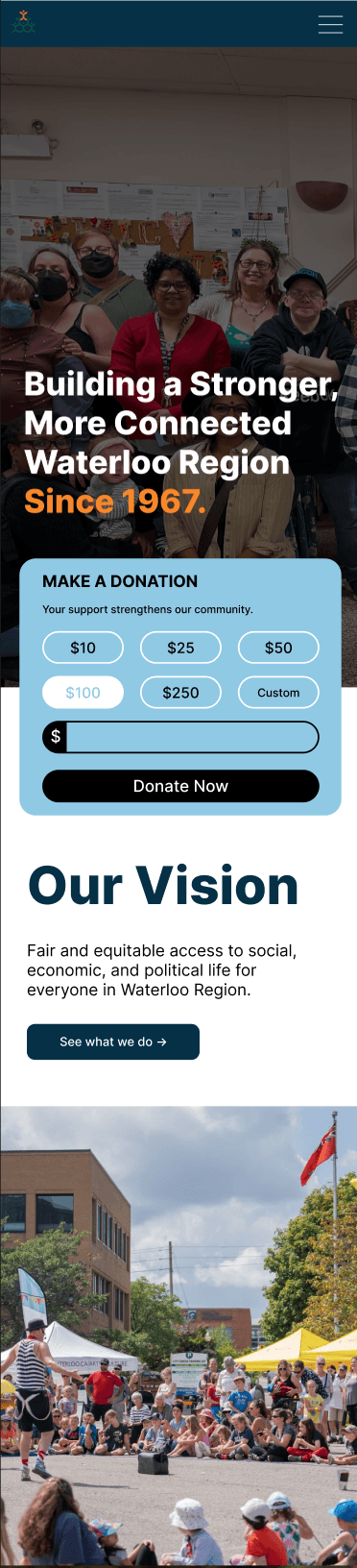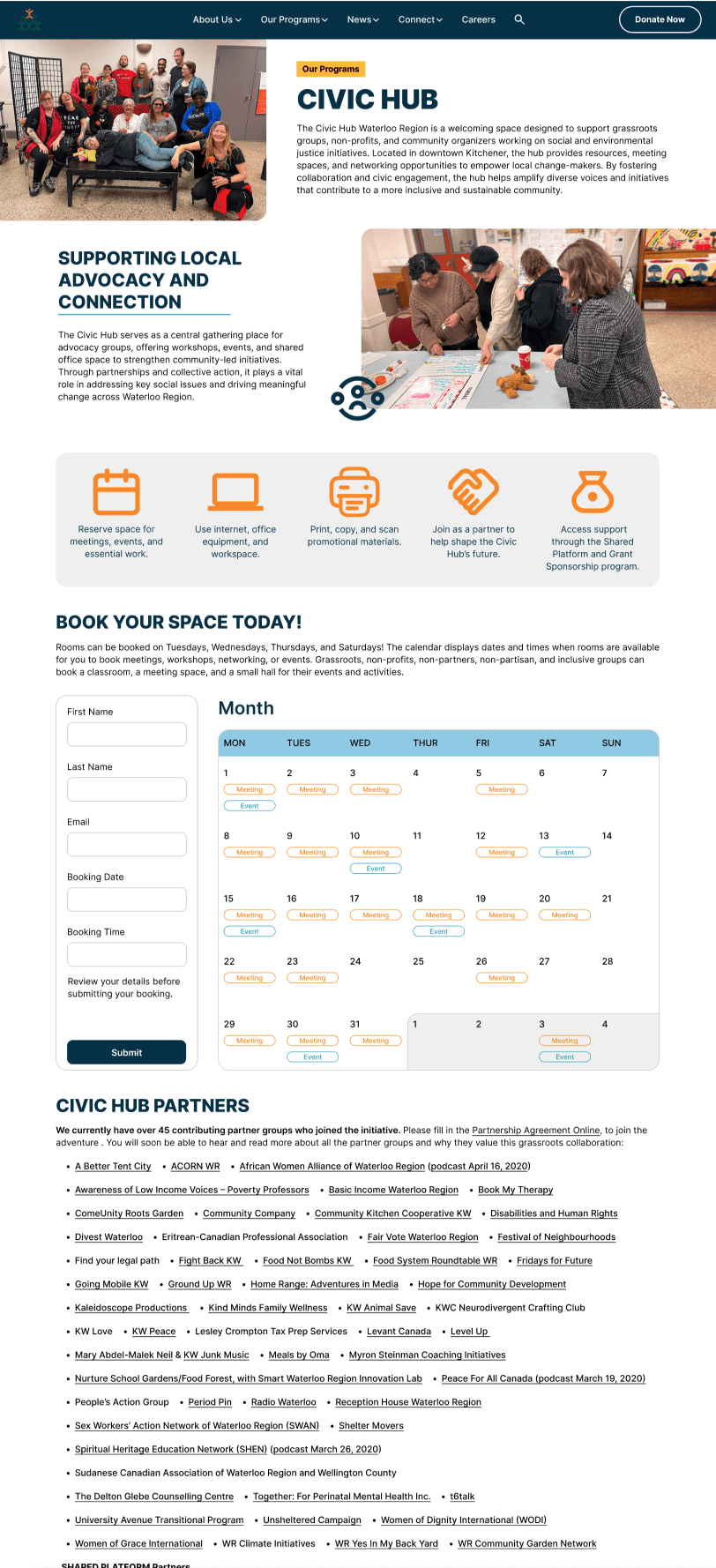 As part of the DAC:300 Digital Research Project course at the University of Waterloo, working in a team of three, we were tasked with partnering with a local non-profit organization to help them rebrand their digital identity, including a logo, colour palette, typography, and most importantly, an improved website prototype. My role focused on designing the landing page, program pages, ecosystem analysis, and navigation planning.