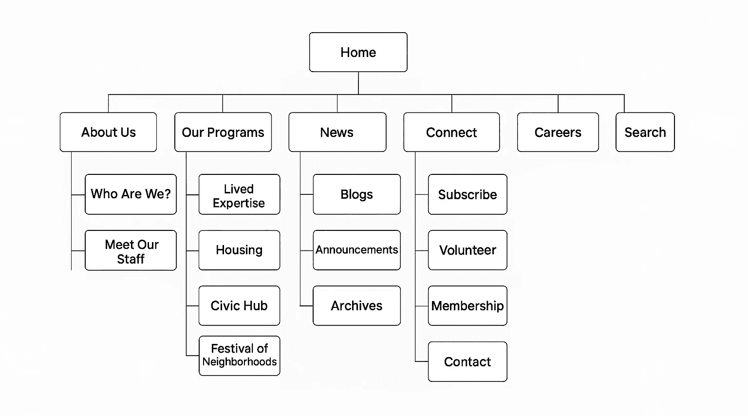 To solve part of the Navigation and UX problem, we created a sitemap to lay out how we want users to navigate the website. Then created a navigation bar in Figma.